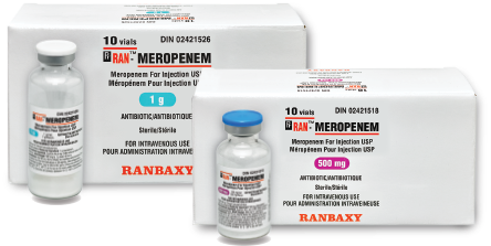 RAN-MEROPENEM (meropenem) is supplied in 30 mL and 40 mL injection vial sizes containing sufficient meropenem to deliver 500 mg and 1 g of meropenem anhydrous respectively for intravenous administration.