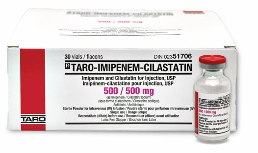 Taro-Imipenem-Cilastatin is supplied as a sterile powder mixture in vials containing imipenem anhydrous USP and cilastatin sodium USP with sodium bicarbonate USP as a buffer as follows: 500 mg imipenem equivalent and 500 mg cilastatin equivalent in clear glass 30 mL vials with a red coloured flip-off seal.